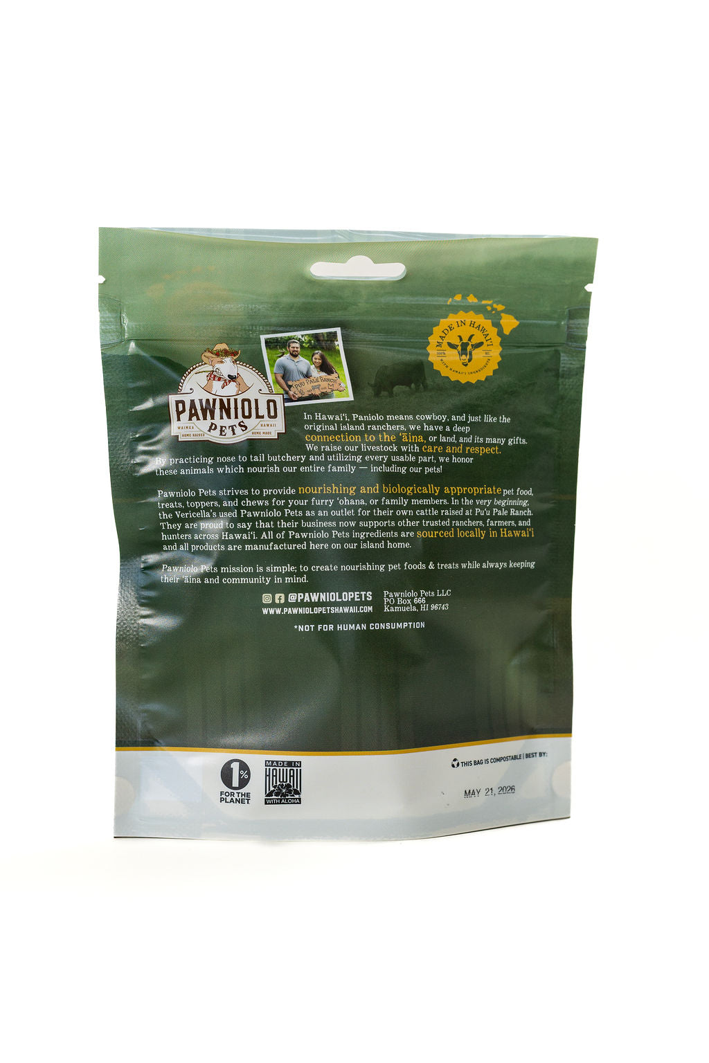 Our innovative packaging is designed to break down directly in your home compost pile, turning waste into nutrient-rich soil for your garden. Our treat bags are made from a combination of cassava, wood pulp and beetroot. Our zippers are made from dent corn. We strive to always keep our planet in mind and not just manage waste, but purposefully utilize it. Aloha ʻĀina always.