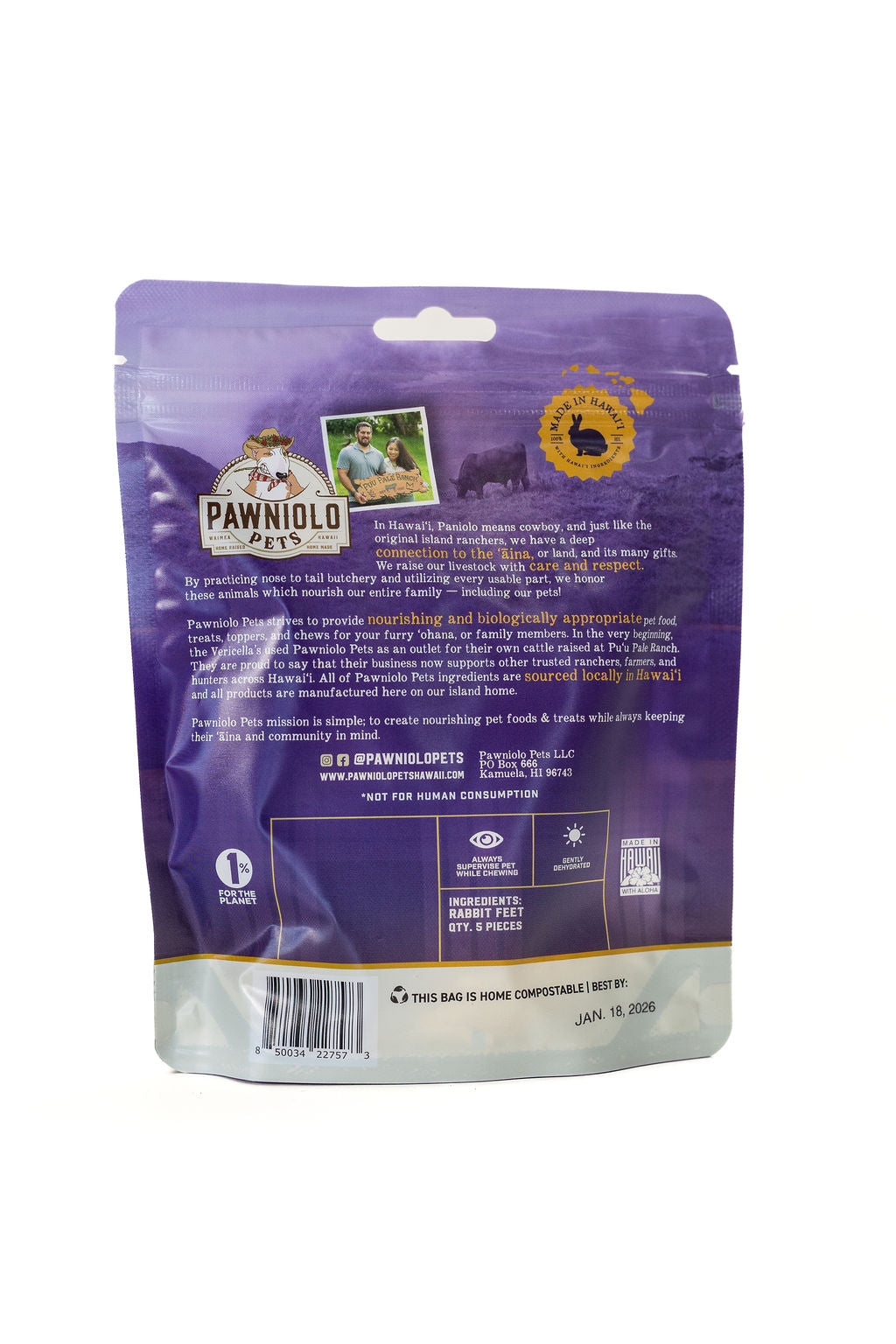 Our innovative packaging is designed to break down directly in your home compost pile, turning waste into nutrient-rich soil for your garden. Our treat bags are made from a combination of cassava, wood pulp and beetroot. Our zippers are made from dent corn. We strive to always keep our planet in mind and not just manage waste, but purposefully utilize it. Aloha ʻĀina always.